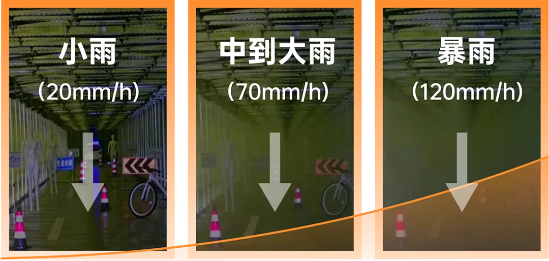 随后的暴雨模拟环节,可视化激光雷达相机的感知性能同样未受降雨强度影响,普通摄像头则被雨雾遮盖。