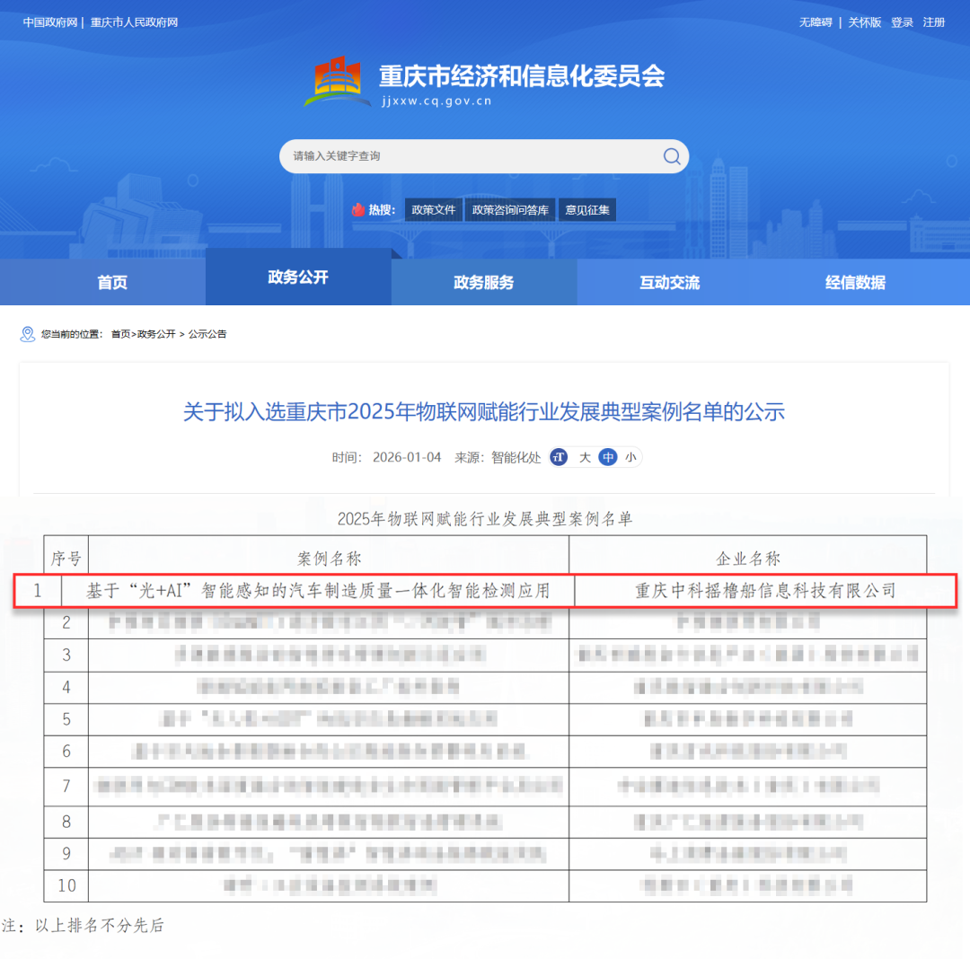 在“十四五”收官与“十五五”谋篇开局的交汇点,以“AI赋能·开启物联新征程”为主题的2025物联重庆创新应用大会于近日举行。会上,中科摇橹船“基于‘光+AI’智能感知的汽车制造质量一体化智能检测应用”被正式授予“2025年重庆市物联网赋能行业发展典型案例”。