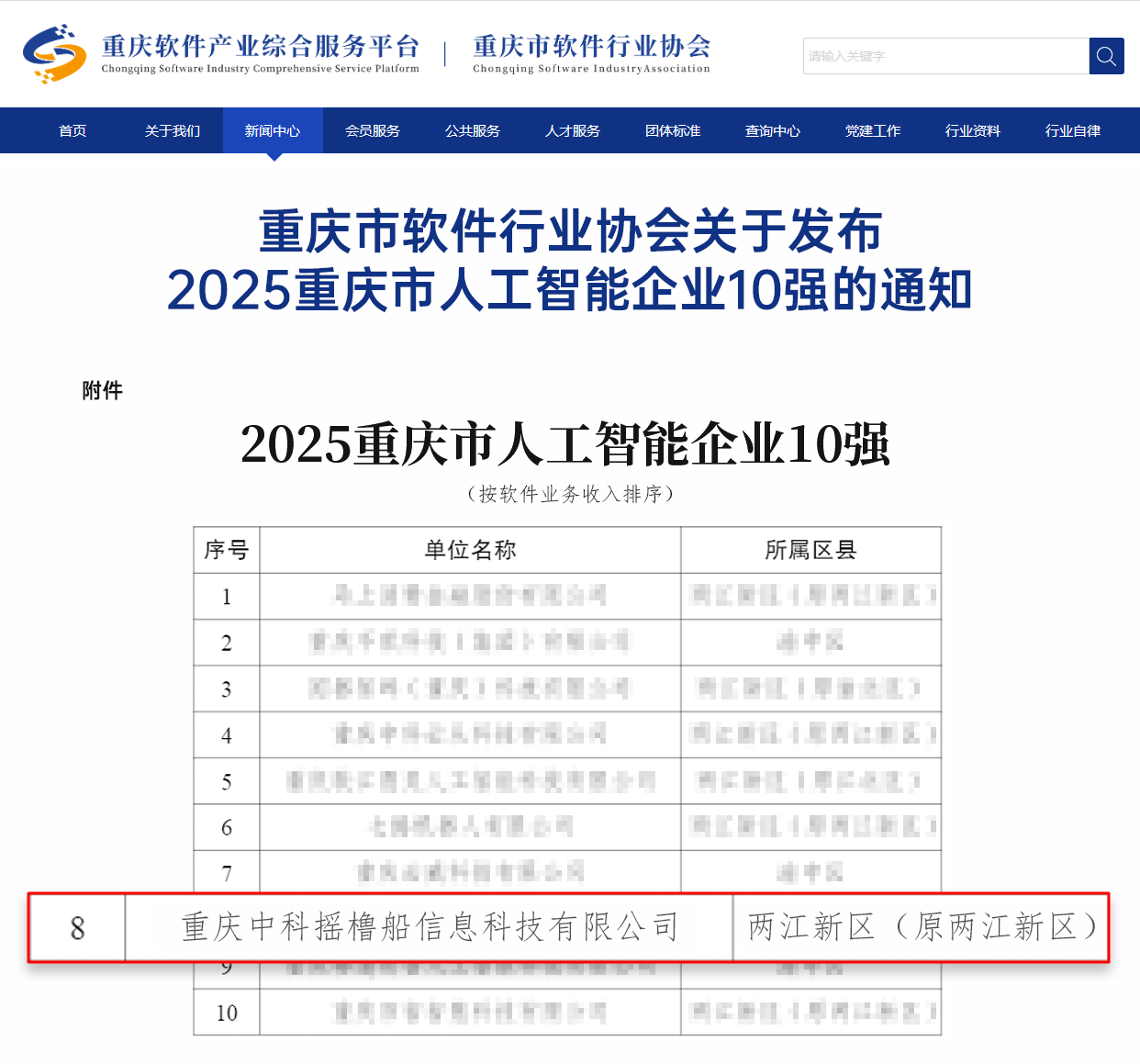 该评选由重庆市软件行业协会组织,是重庆市为落实“满天星”行动计划、推动软件产业高质量发展设立的重要标杆。评选旨在遴选出全市范围内,在人工智能技术研发、产品创新与市场应用上均处于领先地位的“先锋队”企业。经严格初筛、专家评审及社会公示,中科摇橹船跻身“2025重庆市人工智能企业10强”。